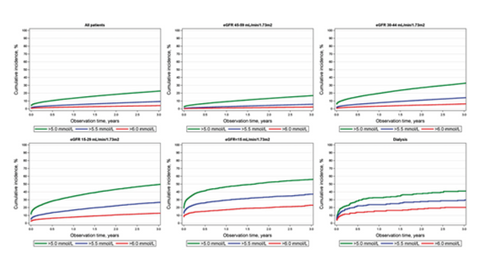 More than one in four CKD patients develops HK. Patients with severe CKD, diabetes, heart failure or use of spironolactone are at high risk. HK is associated with severe clinical outcomes.